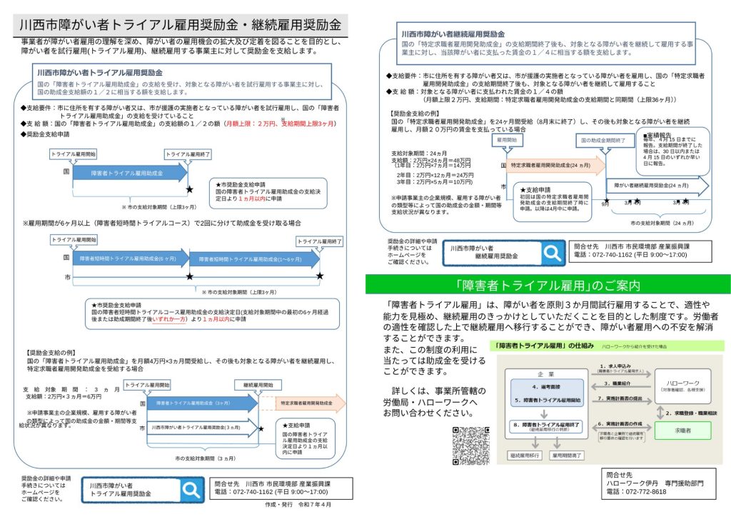川西市では、事業者が障がい者雇用の理解を深め、障がい者の雇用機会の拡大及び定着を図ることを目的として、「川西市に住所を有する障がい者又は川西市が援護の実施者となっている障がい者」を試行雇用(トライアル雇用)、継続雇用する事業主に対して「川西市障がい者トライアル雇用奨励金」と「川西市障がい者継続雇用奨励金」の2つの奨励金制度を実施しています。